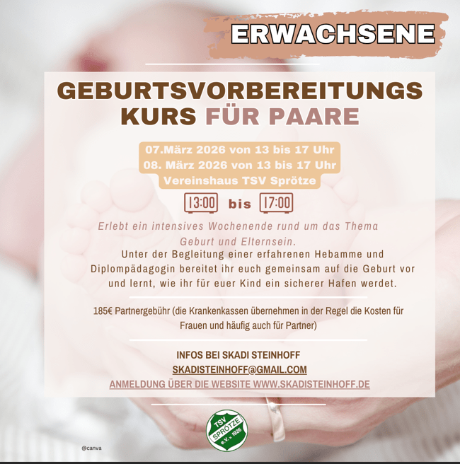 Geburtsvorbereitungskurs von Denise Jusinski | März 4, 2025 | Aktuelles | 0 Kommentare Geburtsvorbereitungskurs (für Paare) am 07. & 08. März 2026 von 13.00-17.00 Uhr Download Flyer